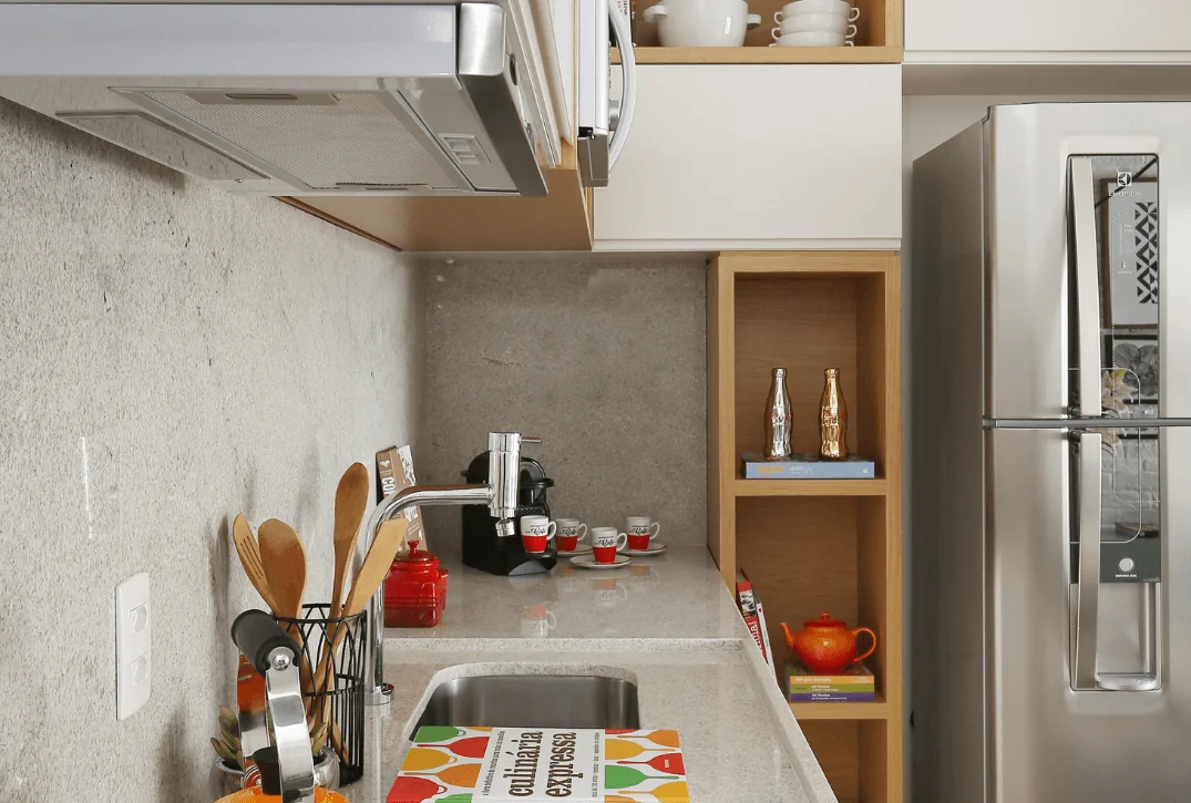 Outra dica é optar por eletrodomésticos embutidos, que se integram melhor ao ambiente e ocupam menos espaço. Itens essenciais incluem um fogão de quatro bocas (ou cooktop com forno embutido), uma geladeira compacta, mas espaçosa, e um micro-ondas.