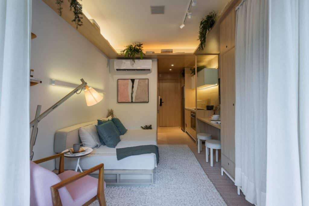 Em apartamentos pequenos e studios, a arquitetura minimalista otimiza cada metro quadrado. O layout integrado amplia a percepção de espaço e melhora a circulação.