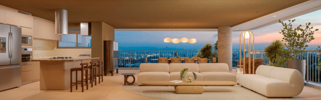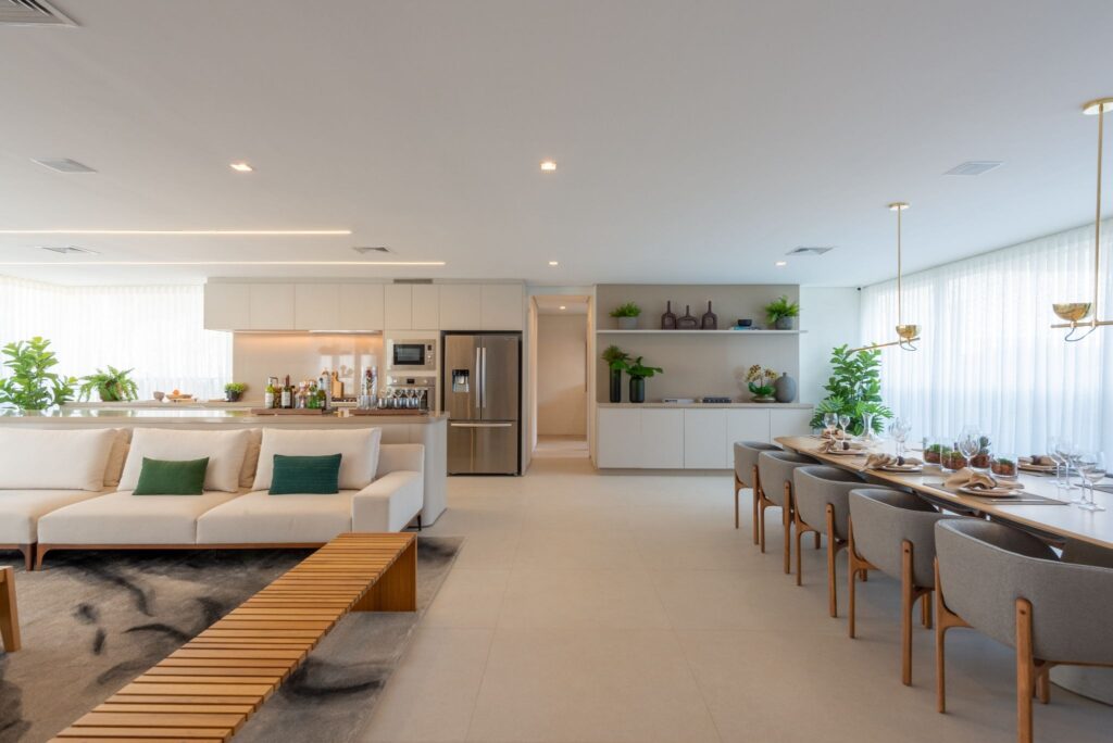Cozinhas, salas e áreas de convivência compartilham o mesmo espaço, com poucos obstáculos visuais. Essa escolha melhora a circulação, facilita a convivência e amplia o aproveitamento da área útil.