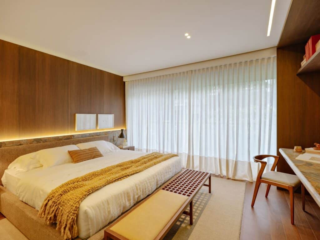 Nos imóveis de alto padrão, o minimalismo aparece de forma sofisticada e precisa. O projeto valoriza volumes amplos, materiais nobres e soluções personalizadas.