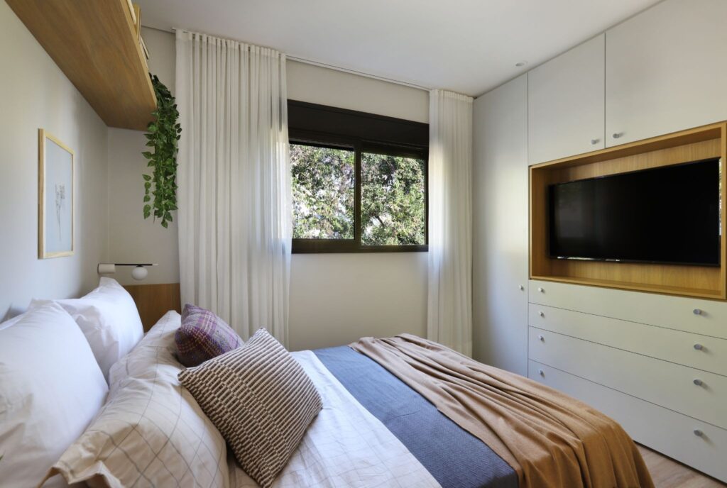 Móveis planejados, poucos objetos e cores claras criam ambientes mais funcionais. Esse tipo de projeto atende bem a quem busca praticidade, organização e estética contemporânea em áreas reduzidas.